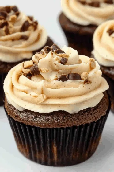 - Once the cupcakes have cooled completely, frost them generously with the espresso buttercream. For garnish, sprinkle the tops with additional toffee bits and chocolate chips, if desired.