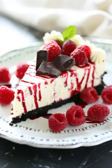 Refrigerate the cheesecake for at least 4 hours—overnight is even better. When it’s time to serve, top it with whipped cream, fresh raspberries, and chocolate shavings. It’s a little extra, but so worth it.
