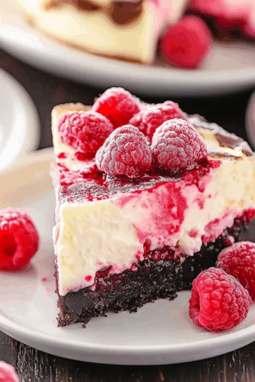 White chocolate cheesecake swirled with raspberry sauce on a chocolate cookie crust—dreamy, tangy, and totally indulgent.