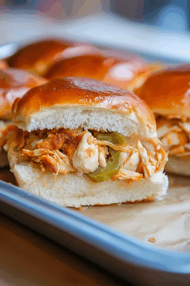 - Preheat the oven to 350°F (175°C). Place the bottom halves of the slider buns in a 9x13-inch baking dish. Layer evenly with cheddar cheese slices, followed by the chicken filling. Top with the remaining jalapeño slices and sprinkle generously with crispy fried onions.